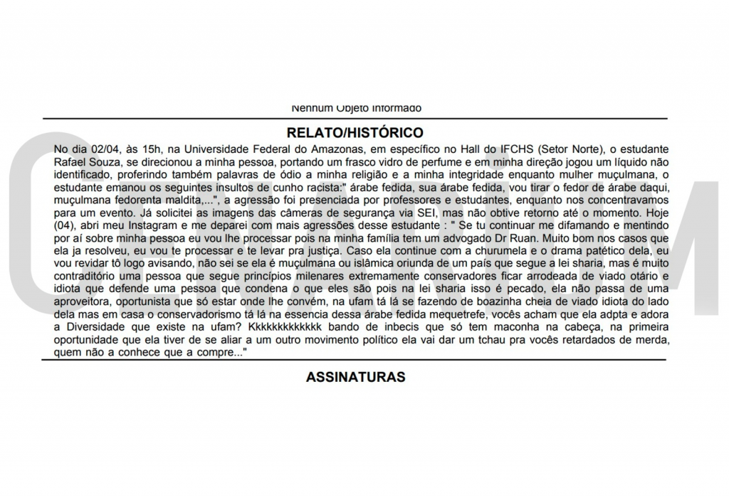 À CENARIUM, a vítima afirmou, neste sábado, 5, que o suspeito proferiu uma série de xingamentos de cunho racista e que outras pessoas presenciaram a ação. Em Boletim de Ocorrência (BO), ao qual a reportagem teve acesso, a estudante árabe denuncia que Rafael Souza direcionou a ela palavras de ódio contra a religião e à integridade dela como mulher muçulmana. “O estudante emanou os seguintes insultos de cunho racista: ‘árabe fedida, sua árabe fedida, vou tirar o fedor de árabe daqui, muçulmana fedorenta, maldita‘”, diz trecho do documento. Veja: