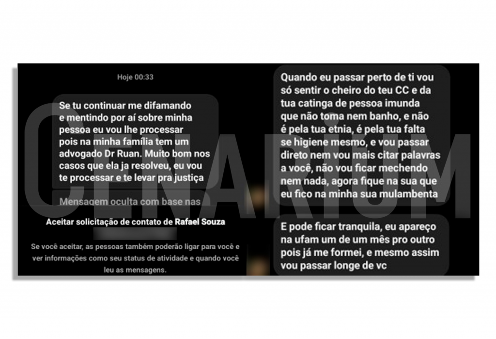 A mestranda afirmou que o suspeito voltou a insultá-la por meio de mensagens em uma rede social. Após essa nova ação, ela denunciou o caso às autoridades por volta das 12h desta sexta-feira. Trechos das mensagens foram inseridos no BO, e a reportagem teve acesso à íntegra do conteúdo. Rafael Souza começa afirmando que pode processar a vítima, caso ela continue a difamá-lo, e volta a xingar Rita. Veja mensagens: