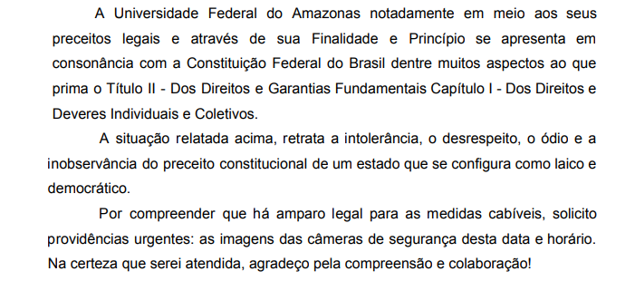 “A situação relatada acima retrata a intolerância, o desrespeito, o ódio e a inobservância do preceito constitucional de um Estado que se configura como laico e democrático. Por compreender que há amparo legal para as medidas cabíveis, solicito providências urgentes: as imagens das câmeras de segurança desta data e horário“, diz trecho do documento. Veja: