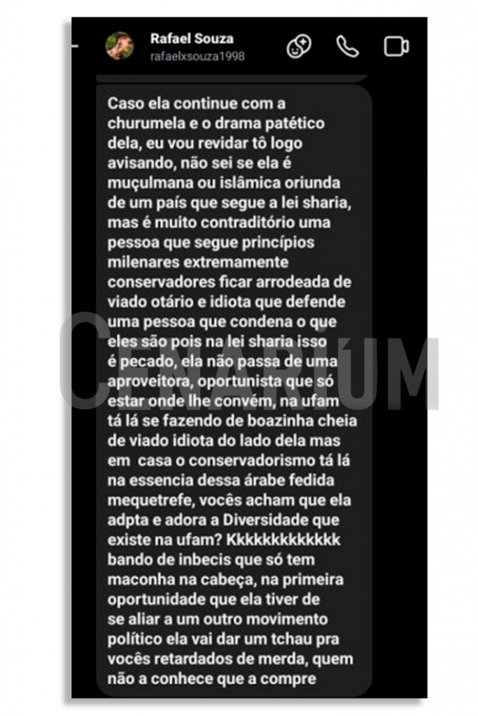 Na sequência, o estudante de Geografia diz que Rita é oportunista e chega a xingar outros estudantes da universidade, que chama de “viado imbecis que só têm maconha na cabeça” e “retardados de merd*”. Ele cita que a mensagem foi encaminhada ao centro acadêmico de Pedagogia da Ufam. Na mesma mensagem, o suspeito diz que “irá revidar” se a vítima “continuar com o drama patético”. Veja mensagens: