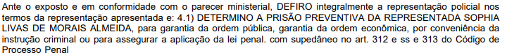 Na decisão, o magistrado mencionou que a prisão da investigada tinha o objetivo de garantir a “ordem pública, a ordem econômica, por conveniência da instrução criminal ou para assegurar a aplicação da lei penal”. Após a audiência de custódia, a Justiça do Amazonas decidiu manter a prisão de Sophia Almeida.