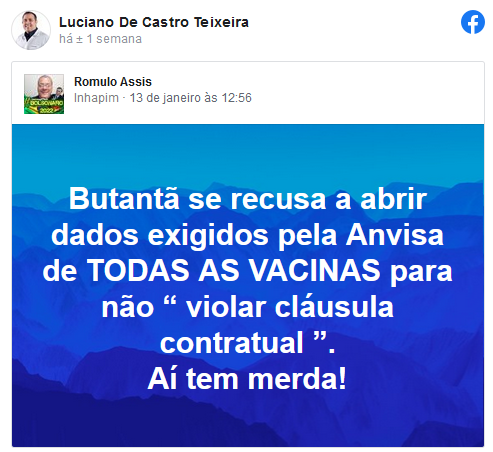 Teixeira também compartilha publicações críticas ao Instituto Butantan, responsável pela CoronaVac no Brasil.