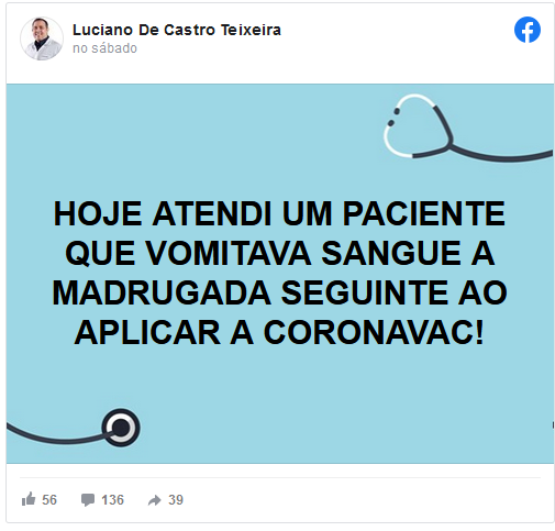 Na publicação, feita na noite de domingo, 23, em seu perfil no Facebook, Teixeira diz ter atendido um paciente “que vomitava sangue na madrugada seguinte ao aplicar a CoronaVac (SIC)”. A declaração, sem detalhes, recebeu uma enxurrada de críticas.