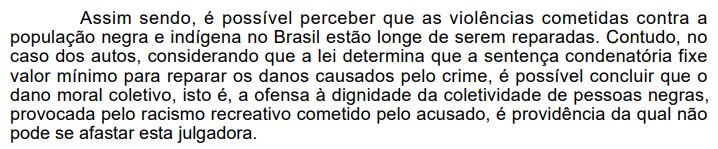 “O vídeo é explícito ao retratar o racismo, já que o caso reforça o estereótipo da sociedade, com o grau de racismo estrutural. Não faz diferença se o caso se trata de uma brincadeira, já que no crime de racismo recreativo, por ser crime de mera conduta, é analisado o dano causado à coletividade, e não o elemento subjetivo do autor”, pontuou a juíza do caso.