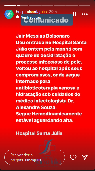 O Hospital Santa Júlia informou que Jair Bolsonaro deu entrada na unidade no sábado, com quadro de desidratação e infecção na perna esquerda, sendo diagnosticado com erisipela. Ele passou por procedimentos e tomou medicamentos para tratar a doença. Recebeu alta no mesmo dia para cumprir agenda em Manaus, mas, na mesma noite, foi readmitido para receber medicação com antibióticos.