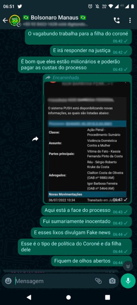 “Eles têm me chamado de estuprador, espancador de mulher e citam um processo que ocorreu após um episódio que, em resumo, envolvia a minha filha que estava comigo e minha ex-mulher que foi até meu apartamento buscá-la. À ocasião, não a deixei entrar no meu apartamento de madrugada e ela se sentiu no direito de ir à delegacia me acusar de tentativa de agressão; rolou o processo e fui absolvido, pois, de fato, não houve nada. Então, eles pegaram esse processo sigiloso, por ser uma questão de família e expuseram todo teor disso para tentar desmotivar as pessoas que são bolsonaristas a não votar em mim“, explica o líder do Movimento Conservador no Amazonas.