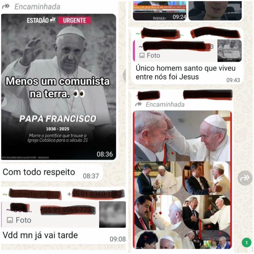 Nas imagens, os policiais também compartilham fotos do papa ao lado de líderes políticos, como o presidente Luiz Inácio Lula da Silva, além de outros chefes de Estado. Em outro trecho das mensagens, um dos participantes afirma: “O único homem santo que viveu entre nós foi Jesus”.