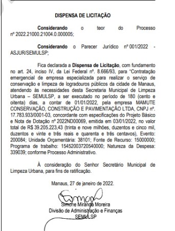 A Secretaria Municipal de Limpeza Pública (Semulsp), gerida pelo secretário Sabá Reis, dispensou uma licitação para “contratação emergencial de empresa especializada para realizar o serviço de conservação e limpeza de logradouros públicos da cidade de Manaus” e firmou contrato com a empresa Mamute Conservação, Construção e Pavimentação Ltda. no valor de mais de R$ 39 milhões. Os valores pagos em contratos da secretaria com a empresa, apenas em 2021, superam R$ 70 milhões.