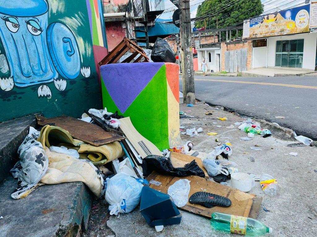 Na esquina da Feira Coberta da Japiinlândia, no bairro Japiim, zona Sul, está o exemplo de como alguns pontos se tornaram lugares de descarte irregular de lixo e permanecem assim. Sacos de comida, móveis e até galhos de árvores podados ficam jogados quase no meio das vias. Nos poucos minutos em que a reportagem esteve no local, moradores despejaram resíduos indiscriminadamente.