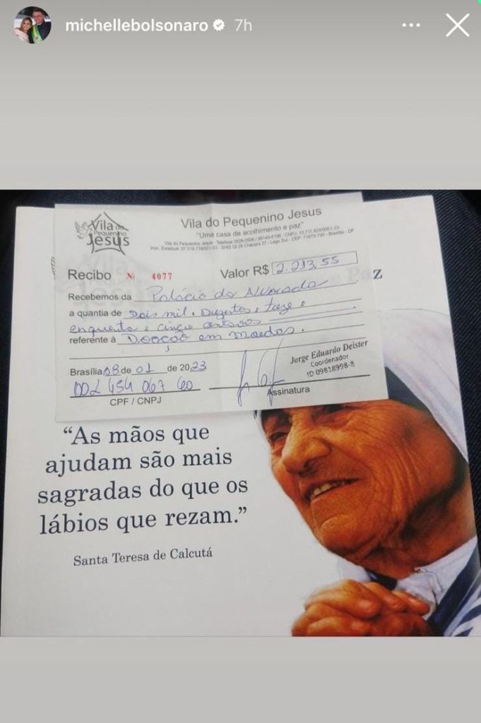 Na “prestação de contas”, Michelle também postou um vídeo de um homem, que se denomina Jorginho, agradecendo as doações das “moedinhas do laguinho”. Porém, Jorginho diz que as moedinhas somaram R$ 2.281,00, ou seja, R$ 63 a mais do que consta no recibo apresentado da ex-primeira-dama.