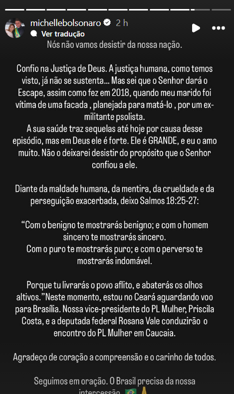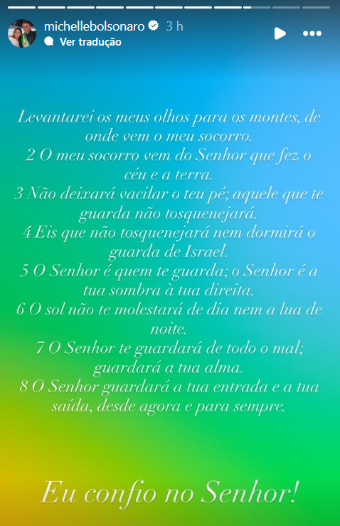 Michelle ainda publicou o salmo 121 com as cores da bandeira do Brasil poucos minutos após a notícia da detenção. A mensagem postada no Instagram veio acompanhada da frase “eu confio no senhor”.