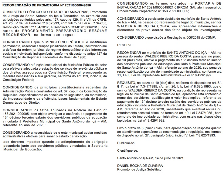 MANAUS – O Ministério Público do Amazonas (MP-AM) recomendou ao prefeito do município de Santo Antônio do Içá (a 879 quilômetros de Manaus), Walder Ribeiro da Costa (Republicanos), para que efetive, no prazo de 10 dias, o pagamento do 13º salário dos servidores públicos da educação da prefeitura, referente ao ano de 2020, sob pena de responsabilização por ato de improbidade administrativa.
