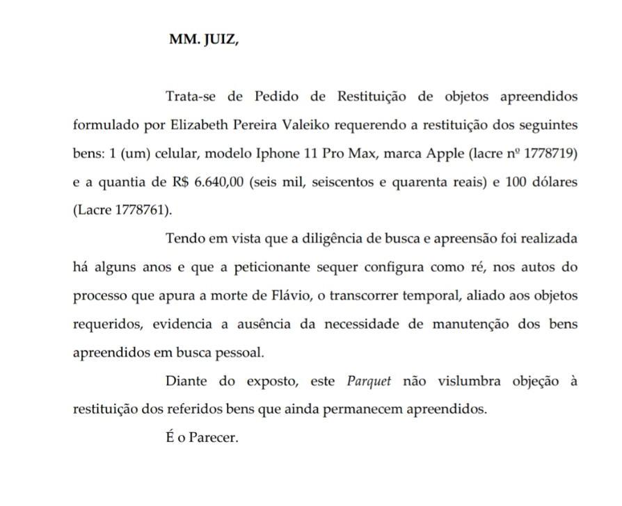 “Tendo em vista que a diligência de busca e apreensão foi realizada há alguns anos e que a peticionante sequer configura como ré, nos autos do processo que apura a morte de Flávio, o transcorrer temporal, aliado aos objetos requeridos, evidencia a ausência da necessidade de manutenção dos bens apreendidos em busca pessoal“, consta o documento.