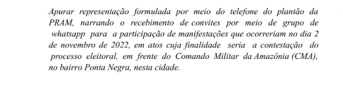 “Apurar representação formulada por meio do telefone do plantão da PRAM, narrando o recebimento de convites por meio de grupo de WhatsApp para a participação de manifestações que ocorreriam no dia 2