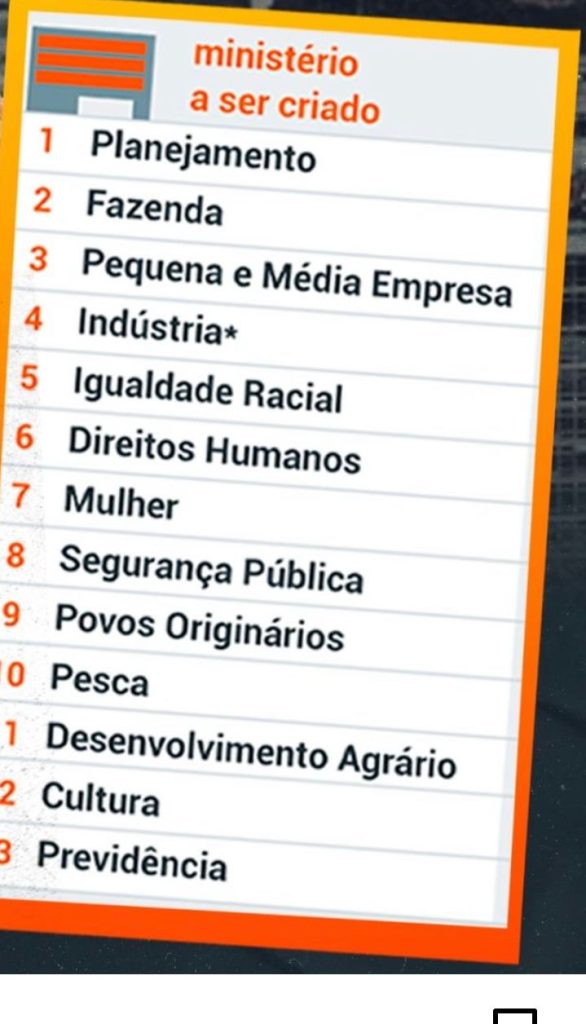 Bolsonaro fundiu pastas que Lula quer agora segregar. É o caso das recriações dos Ministérios do Planejamento, Indústria e Comércio Exterior, do Desenvolvimento Social, da Cultura, da Pesca, da Segurança Pública e da Igualdade Racial.