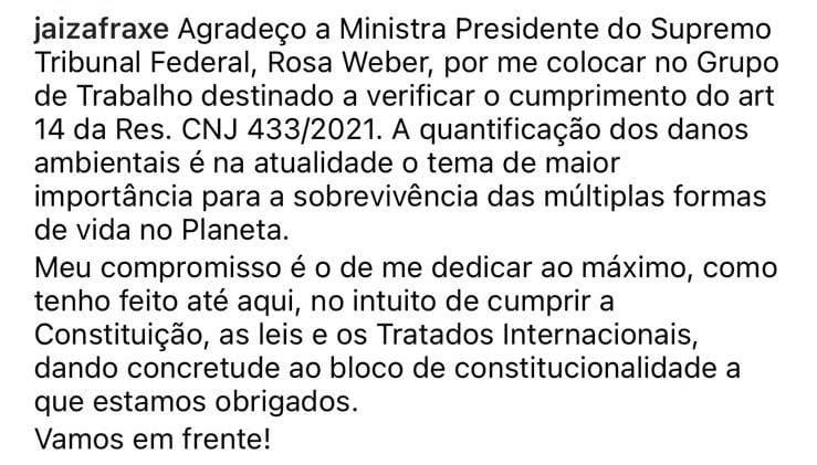 Nas redes sociais, a juíza Jaiza Fraxe agradeceu à ministra Rosa Weber pela indicação. Além disso, a magistrada afirmou que o tema no qual vai atuar é essencial e um dos mais importantes para a manutenção das próximas gerações.