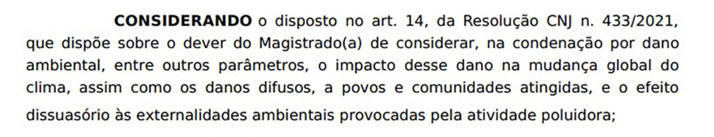 O referido artigo explica que: “Na condenação por dano ambiental, o(a) magistrado(a) deverá considerar, entre outros parâmetros, o impacto desse dano na mudança climática global, os danos difusos a povos e comunidades atingidos e o efeito dissuasório às externalidades ambientais causadas pela atividade poluidora”.