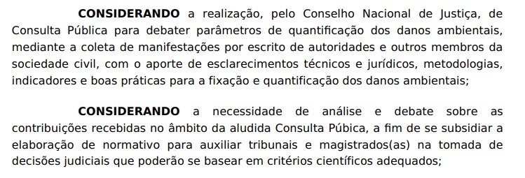 A portaria ainda determina a realização de consulta pública, a fim de debater os parâmetros de quantificação dos danos ambientais, a partir da coleta de manifestações por escrito de autoridades e outros membros da sociedade civil. O evento será promovido em formato híbrido, no próximo dia 27, no auditório do CNJ com transmissão pelo canal do órgão no YouTube, das 9h às 18h.
