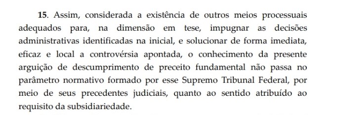 “Assim, considerada a existência de outros meios processuais adequados para, na dimensão em tese, impugnar as decisões administrativas identificadas na inicial, e solucionar, de forma imediata, eficaz e local, a controvérsia apontada, o conhecimento da presente arguição de descumprimento de preceito fundamental não passa no parâmetro normativo formado por esse Supremo Tribunal Federal, por meio de seus precedentes judiciais, quanto ao sentido atribuído ao requisito da subsidiariedade”, afirmou Weber na decisão.