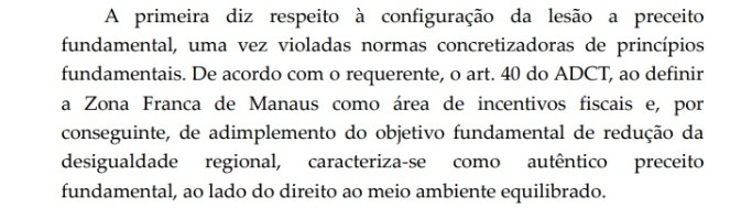 O Governo do Amazonas pontuou que o não reconhecimento do crédito de ICMS viola os preceitos de proteção constitucionais da Zona Franca de Manaus, sobre redução das desigualdades regionais, e ao direito fundamental ao meio ambiente equilibrado.
