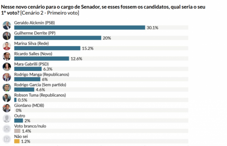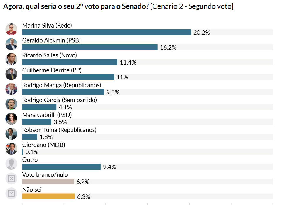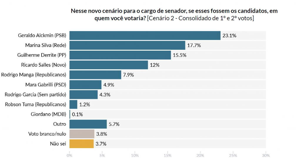 Nas intenções de voto para a primeira vaga do Senado por São Paulo, Marina Silva aparece com 15,2%, atrás de Alckmin, com 30,1%, e Derrite, com 20%. Em seguida, estão Salles, com 12,6%; Gabrilli, com 6,3%; Manga, com 6%; Garcia, com 4,6%; Tuma, com 0,5%; e Giordano, com 0%.