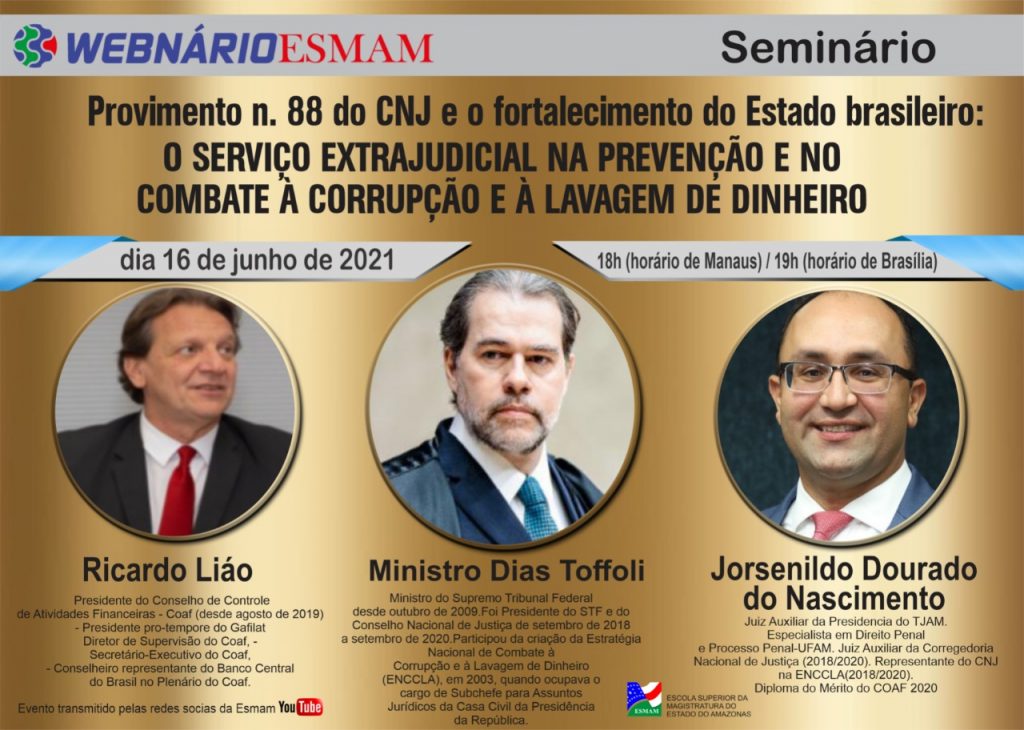 O magistrado formador do curso é o juiz de Direito do TJAM, Jorsenildo Dourado do Nascimento, que explicou que ”no decorrer do curso tivemos várias lives com expoentes personalidades do cenário jurídico, notarial e registral do Brasil e, para o encerramento do curso, será feito este webnário, com a presença do ministro do Supremo Tribunal Federal, Dias Toffoli e o presidente do Coaf, Ricardo Liao”.