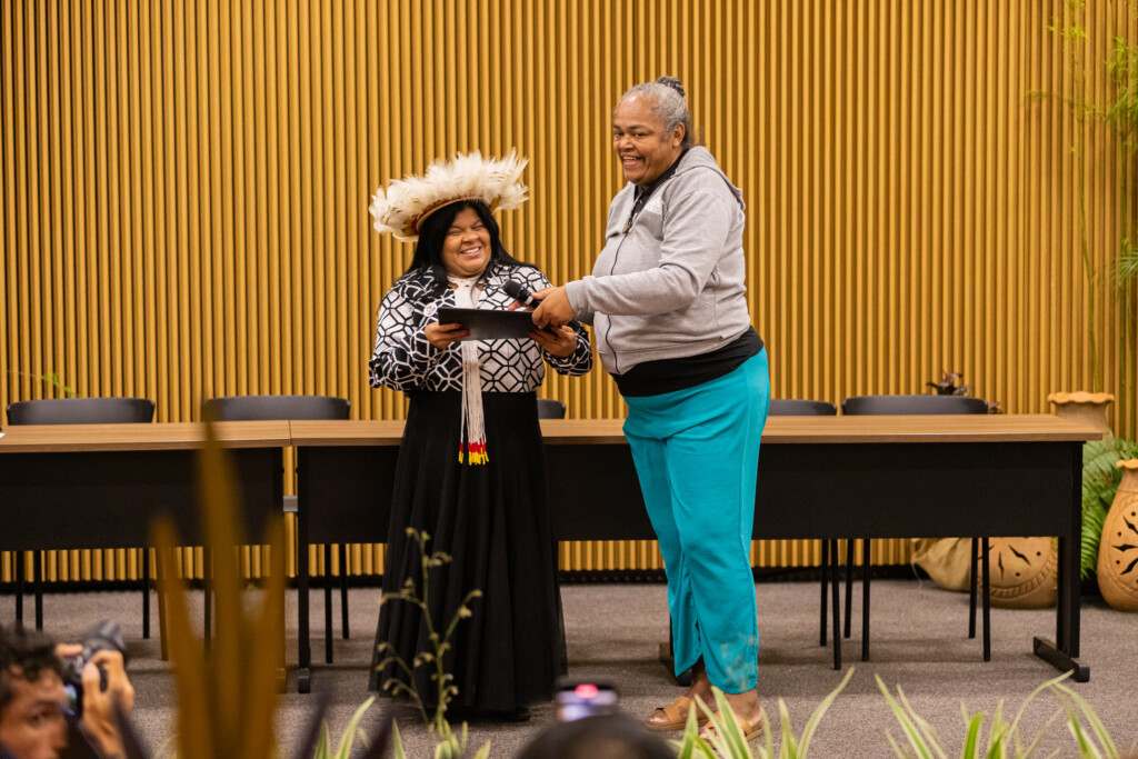 “Aqui tem uma história – não apenas indígena, mas uma história de Brasil. Recebo este documento firmando o compromisso de levar adiante a discussão, para que haja reparação não só pelo passado, mas também pelo presente, porque a violência contra os povos indígenas ainda não cessou”, afirmou a ministra Sonia Guajajara, ao receber a minuta de decreto das mãos da indígena Elisa Pankararu, coordenadora executiva do Departamento de Mulheres Indígenas da Articulação dos Povos e Organizações Indígenas do Nordeste, Minas Gerais e Espírito Santo (Apoinme).