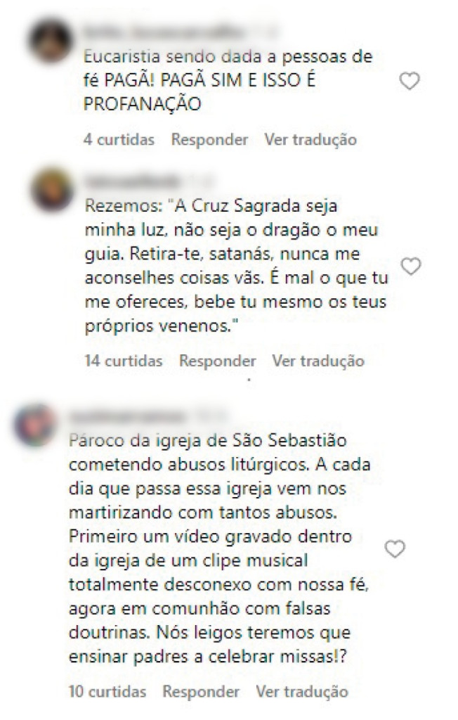 “Pároco da Igreja de São Sebastião cometendo abusos litúrgicos. A cada dia que passa essa igreja vem nos martirizando com tantos abusos. Primeiro um vídeo gravado dentro da igreja de um clipe musical totalmente desconexo com nossa fé, agora em comunhão com falsas doutrinas. Nós leigos teremos que ensinar padres a celebrar missas!?“, afirma outra.
