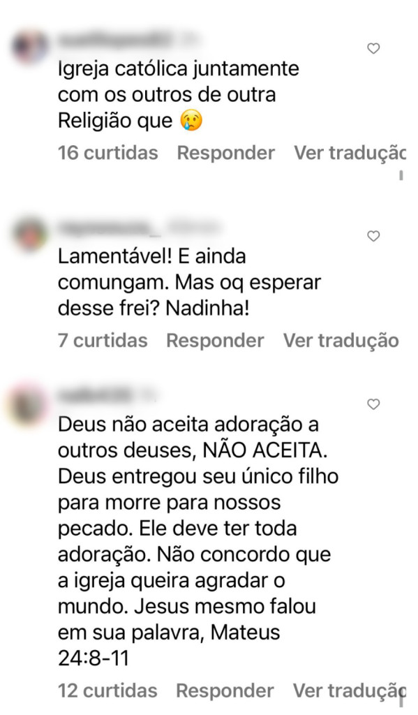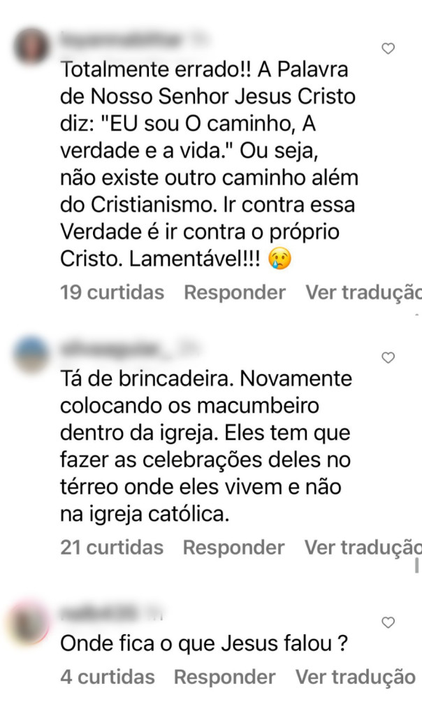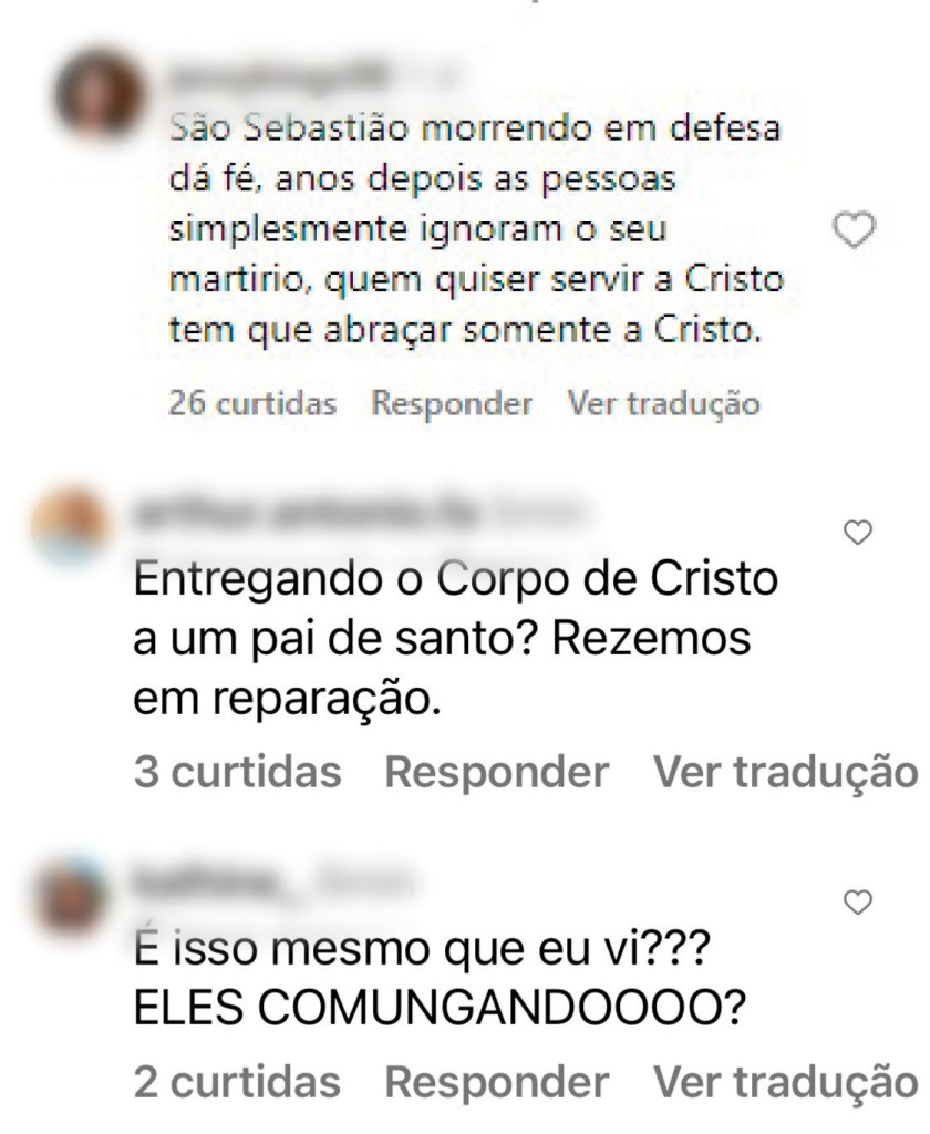 Nos comentários, muitas declarações se referem às religiões de matriz africana como “pagãs”, “falsas doutrinas” ou chamam os adeptos como “macumbeiros”. “Eucaristia sendo dada a pessoas de fé pagã! Pagã sim e isso é profanação!“, afirma uma pessoa.