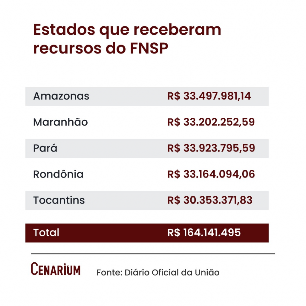 O Estado do Maranhão deverá receber R$ 33,2 milhões, sendo R$ 23,2 milhões para ações de investimento da Secretaria de Segurança e R$ 9,9 milhões para custeio.