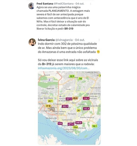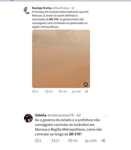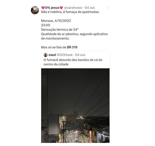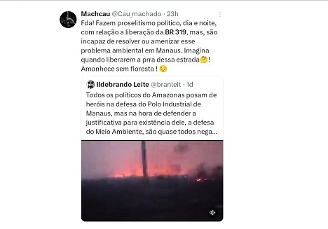 MANAUS – Na última semana, a população de Manaus “inunda” as redes sociais com uma onda de manifestações na rede social X (antigo Twitter) expressando sua crescente preocupação com o aumento das queimadas ao longo da rodovia BR-319. Essa via, que cruza a Amazônia, tem sido palco de incêndios recorrentes que lançam uma nuvem densa de fumaça sobre a cidade, impactando não apenas a qualidade do ar, mas também a saúde e a vida cotidiana dos habitantes da capital amazonense e de municípios do interior.