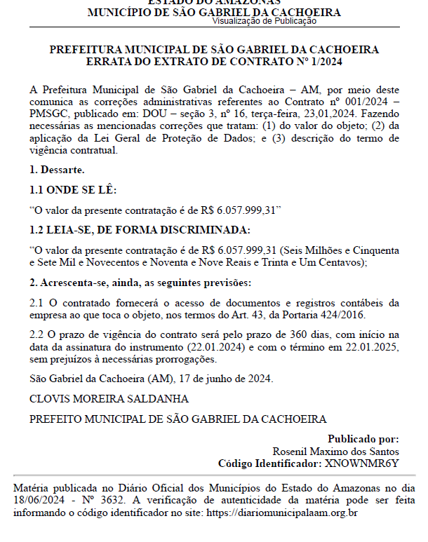 A contratação foi assinada pelo prefeito Clovis “Curubão” Saldanha no valor de R$ 6 milhões, conforme outra publicação de “correções administrativas”, do dia 18 de de junho de 2024. O contrato possui uma vigência de 1 ano, mas, até o momento, as obras não foram iniciadas.
