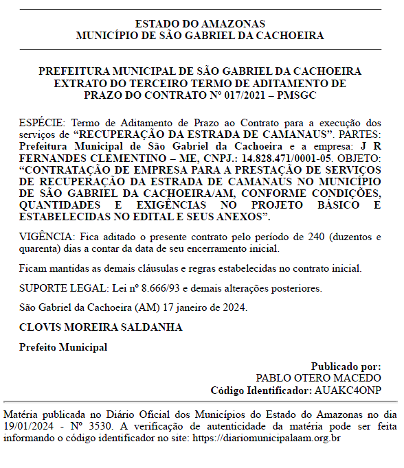 No Diário Oficial da prefeitura do município, publicado no dia 19 de janeiro deste ano, consta contrato com a empresa J R Fernandes Clementino – ME, sob CNPJ 14.828.471/0001-05, para as obras de asfaltamento do trecho da estrada Camanaus.