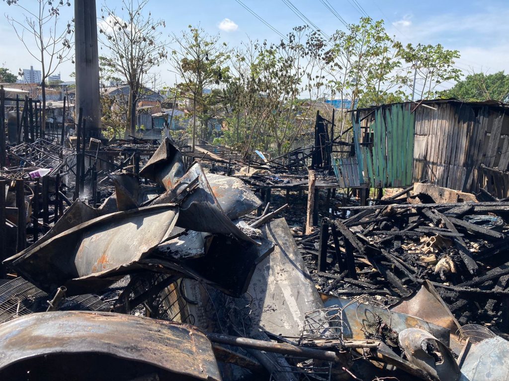 MANAUS – Os moradores afetados pelo incêndio na Rua Ambrósio Aires, bairro São Jorge, Zona Oeste de Manaus, pularam em um igarapé próximo às residências para tentar se salvar das chamas que consumiam as casas de palafita. O fogo que destruiu 16 residências deixou 17 famílias, com ao menos 51 pessoas, desabrigadas e com apenas a roupa do corpo como pertences.