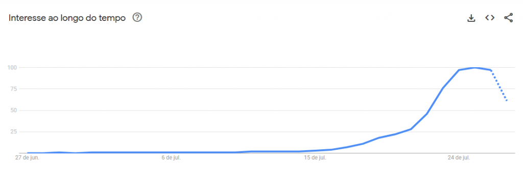 O Morango do Amor ganhou força a partir da segunda metade do mês de julho e segue em crescimento no Google Trends. Termos como “onde comprar”, “receita” e “o que é” estão em destaque de buscas sobre o assunto.
