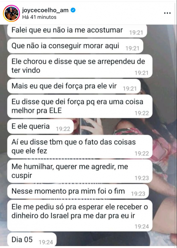 Na sequência, a vítima informa que o namorado pediu a ela que esperasse um homem, identificado na conversa como “Israel”, efetuar um pagamento para o retorno ao Amazonas. “Dia 05”, escreveu. Veja: