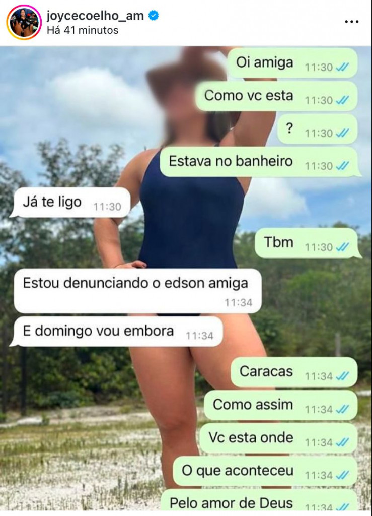 Na legenda da publicação que revelou as conversas mantidas entre a vítima e pessoas próximas antes do crime, Joyce Coelho faz um alerta para que as mulheres “não desprezem os sinais! A vítima de feminicídio vê o ciclo se repetindo até a agressão fatal!”, declarou.