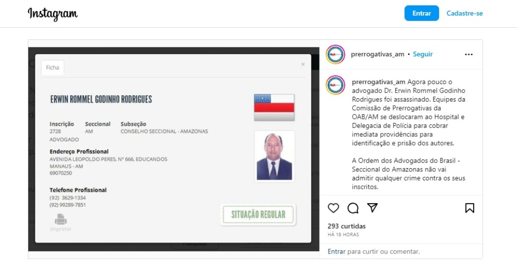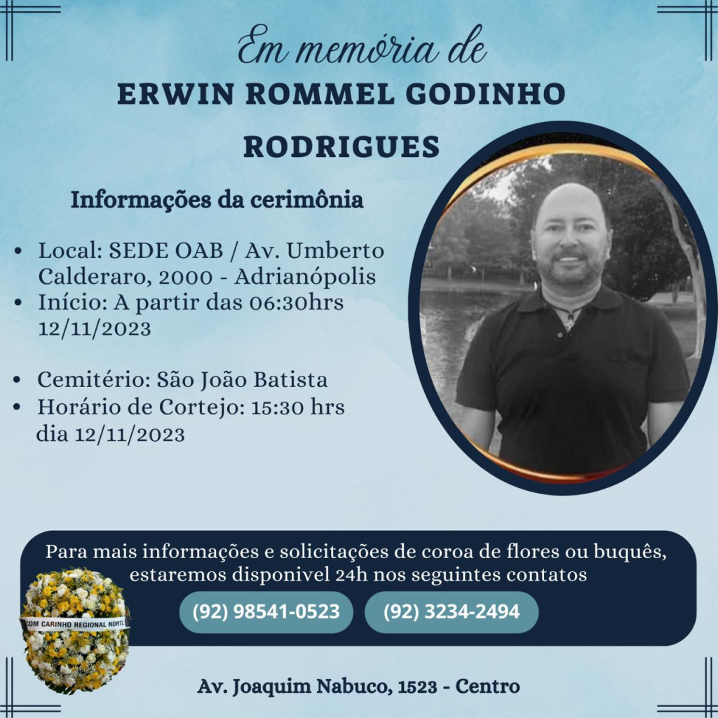 MANAUS (AM) – O corpo do advogado e servidor do Tribunal de Contas do Estado do Amazonas (TCE-AM) Erwin Rommel Godinho Rodrigues, 54, morto após sair de um restaurante na zona Oeste de Manaus, na tarde deste sábado, 11, está sendo velado na sede da Ordem dos Advogados do Brasil (OAB). O enterro está previsto para acontecer na tarde deste domingo, 12, no Cemitério São João Batista, zona Sul da capital.