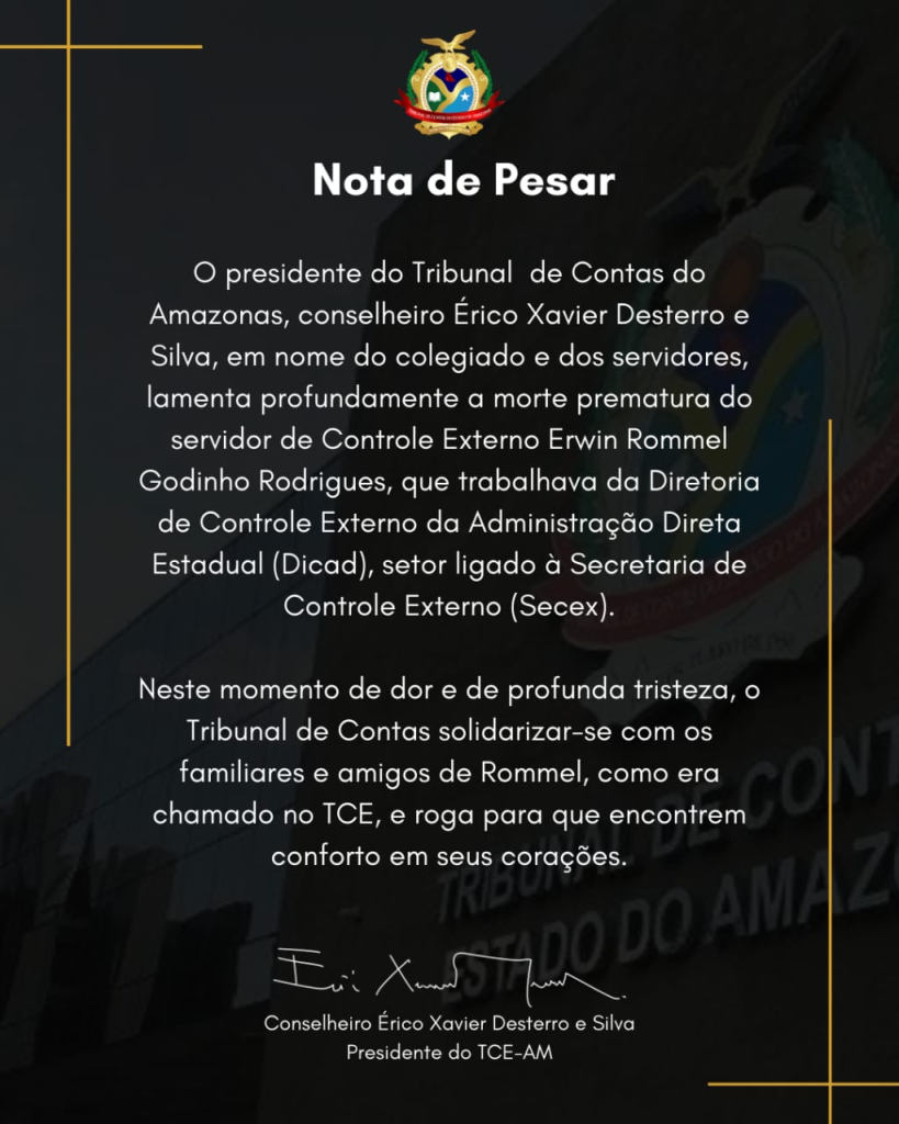 Em nota, o presidente da Corte de Contas, conselheiro Érico Desterro, lamentou a morte do servidor que trabalhava na diretoria de Controle Externo da Administração Direta Estadual (Dicad). “Neste momento de dor e profunda tristeza, o Tribunal de Contas solidariza-se com os familiares e amigos de Rommel, como era chamado no TCE, e roga para que encontrem conforto em seus corações”.