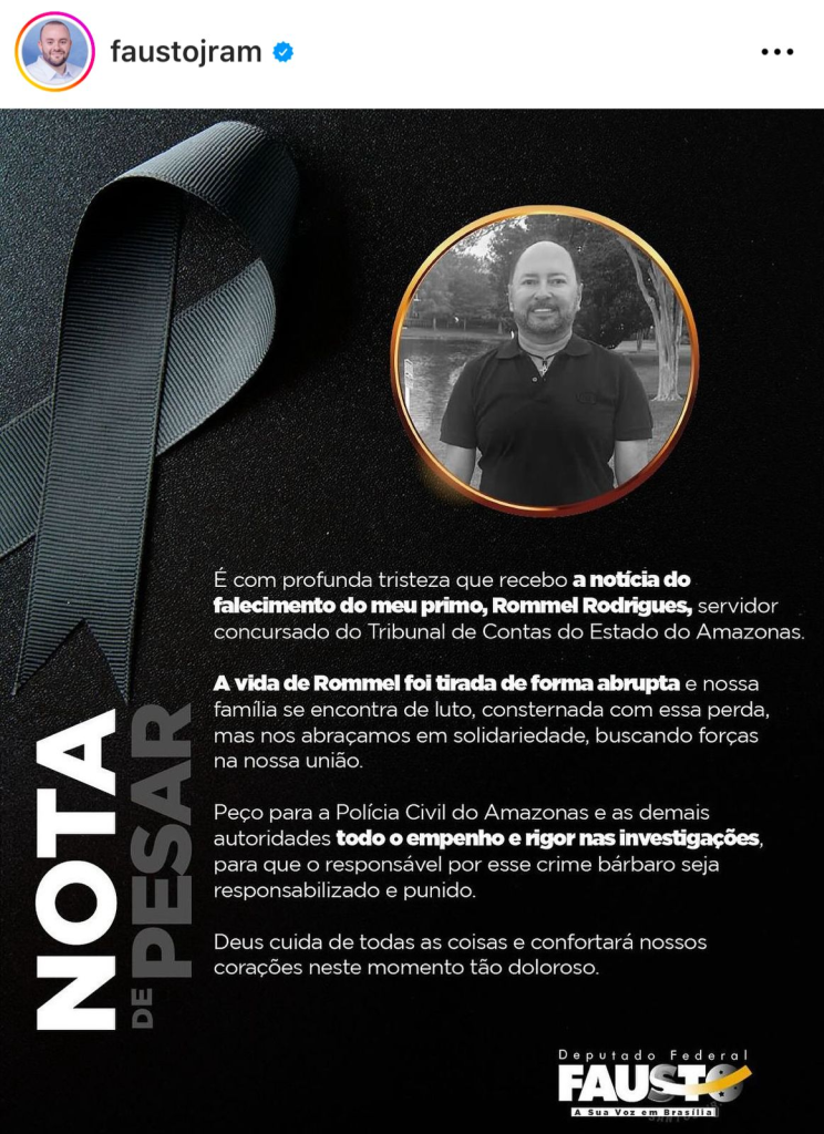 O deputado federal e primo da vítima, Fausto Júnior, também lamentou a morte do servidor. “A vida de Rommel foi tirada de forma abrupta e nossa família se encontra de luto, consternada com essa perda, mas nos abraçamos em solidariedade, buscando forças na nossa união”, escreveu o parlamentar, na rede social Instagram, que também cobrou as autoridades.