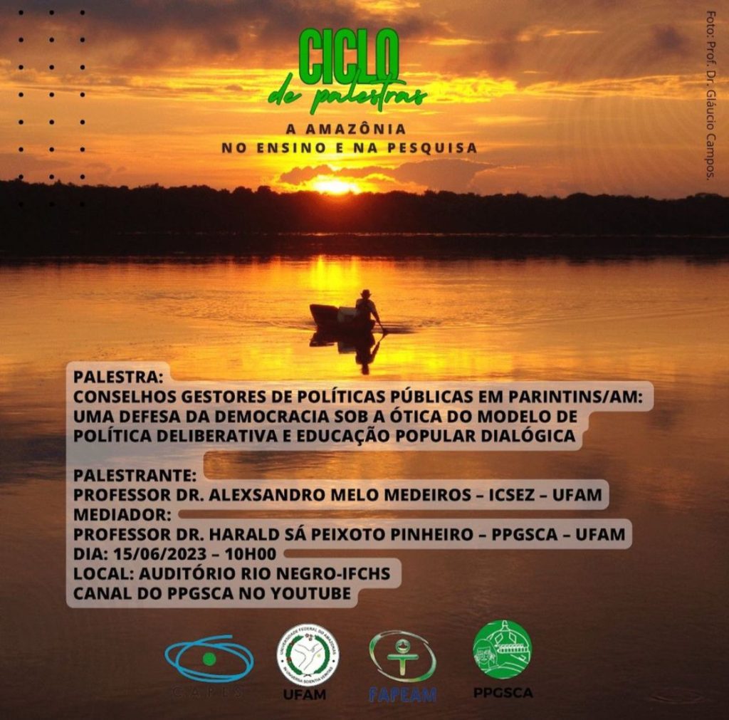Para encerrar a programação desta semana, estão programadas duas palestras para esta quinta-feira,15. Uma será realizada pela manhã e outra à tarde. Às 10h, o professor Dr. Alexsandro Melo Medeiros irá falar sobre “Conselhos de Gestores de Políticas Públicas em Parintins”, no Amazonas, com foco na defesa da democracia sob a ótica do modelo de política deliberativa e educação popular dialógica. A mediação será feita pelo professor Dr. Harald Sá Peixoto Pinheiro.