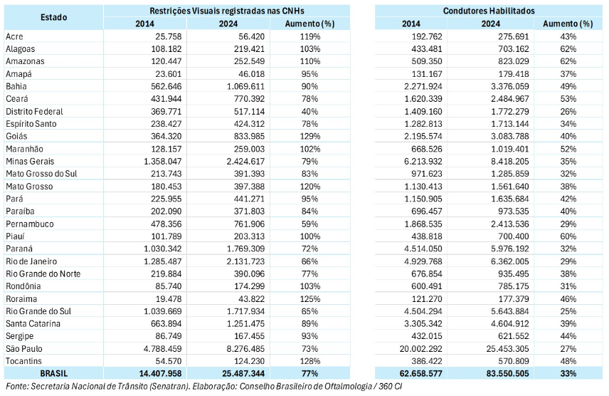 Em 2014, 14,4 milhões de motoristas só podiam conduzir veículos com o uso obrigatório de óculos ou lentes de grau. O grupo inclui ainda pessoas com restrição para dirigir após o pôr do sol e aquelas com visão monocular (visão igual ou inferior a 20% em um dos olhos). Em 2024, esse total já alcança 25,4 milhões – um aumento de 77%.