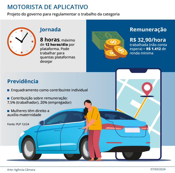 A proposta do governo estabelece que o valor por hora trabalhada por aplicativo seja distribuído em 25% para remuneração e 75% para cobertura de custos, o que serviria de indenização para cobrir despesas com uso do telefone celular, combustível, manutenção do veículo, seguro e impostos. No total, seriam pagos no mínimo R$ 32,90 por hora trabalhada.