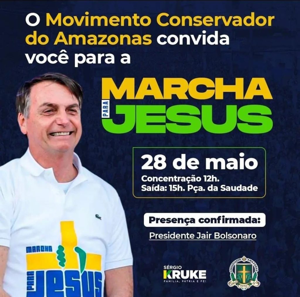 MANAUS – Em convite divulgado nas redes sociais e aplicativos de mensagem, o Movimento Conservador do Amazonas classifica como “presença confirmada” a participação do presidente Jair Bolsonaro (PL) na Marcha para Jesus, em Manaus, que acontece no próximo sábado, 28.