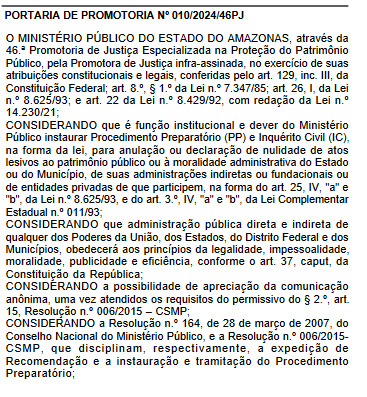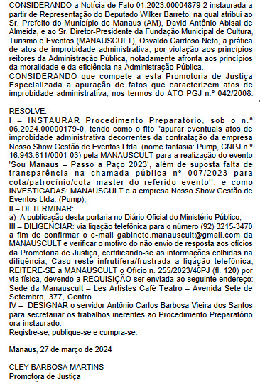 Uma Portaria para iniciar um procedimento foi assinada pela promotora Cley Barbosa Martins, da 4ª Promotoria de Justiça Especializada na Proteção do Patrimônio Público, e publicada no Diário Oficial do MP-AM na última sexta-feira (5). Nela, são atribuídos ao prefeito de Manaus, David Almeida, e ao diretor-presidente da Manauscult, Osvaldo Cardoso Neto, a prática de atos de improbidade administrativa, por violação aos princípios reitores da Administração Pública, especialmente afrontando os princípios da moralidade e eficiência na Administração Pública. Veja a publicação no Diário Oficial do MPAM:
