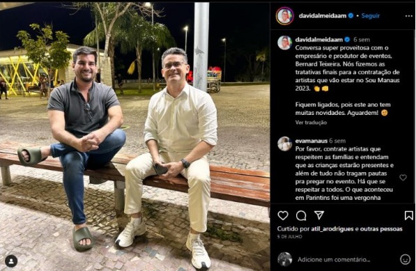 Wilker também solicitou uma investigação sobre o encontro entre David Almeida e o proprietário da Pump, Bernard da Costa Teixeira. Ele expressou preocupação com a natureza do encontro, que foi registrado pelo próprio prefeito e compartilhado nas redes sociais, alegando que causou “estranheza”. Na publicação de 5 de julho, Bernard comentou que o prefeito era humilde e descreveu o encontro para discutir o evento como tendo ocorrido em uma parada de ônibus. Na imagem, Almeida é visto sentado em um banco de parada de ônibus ao lado do empresário da Pump, com a legenda: “Conversa super proveitosa com o empresário e produtor de eventos, Bernard Teixeira. Nós fizemos as tratativas finais para a contratação de artistas que vão estar no Sou Manaus 2023”.