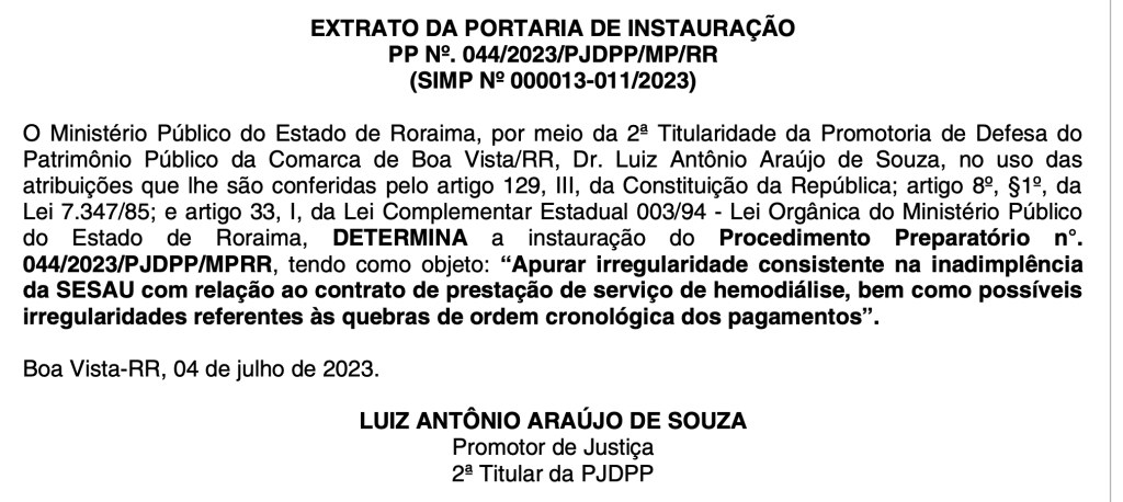 Boa Vista (RR) – O Ministério Público de Roraima (MP-RR) determinou a instauração do Procedimento Preparatório 044/2023 para apurar “irregularidade consistente” na inadimplência da Secretaria Estadual de Saúde (Sesau/RR) com relação ao contrato de prestação de serviço de hemodiálise, bem como possíveis irregularidades referentes às quebras de ordem cronológica nos pagamentos do mesmo serviço.