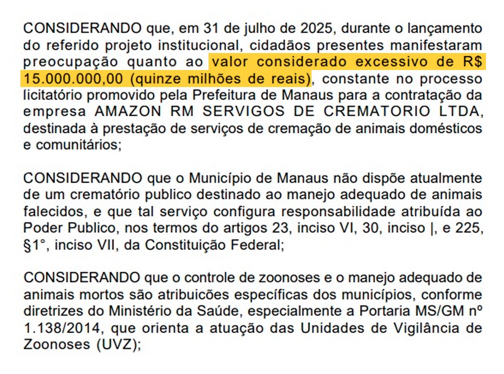 De acordo com o MP-AM, durante o lançamento de um projeto institucional em 31 de julho, cidadãos manauaras presentes manifestaram preocupação com o valor de R$ 15 milhões previsto no processo licitatório da Prefeitura de Manaus para a contratação da empresa responsável pela prestação de serviços de cremação.