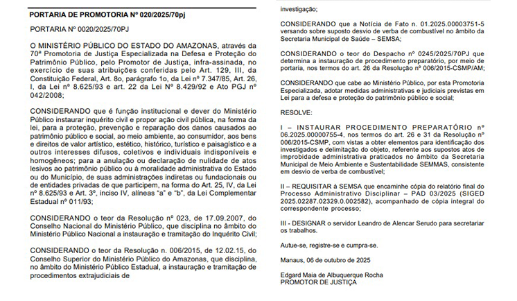 “Instaurar procedimento preparatório N° 06.2025.00000755-4, nos termos do Art. 26 e 31 da Resolução N° 006/2015-CSMP, com vistas a obter elementos para identificação dos investigados e delimitação do objeto, referente aos supostos atos de improbidade administrativa praticados no âmbito da Secretaria Municipal de Meio Ambiente e Sustentabilidade (Semmas), consistente em desvio de verba de combustível“, consta no trecho da portaria.