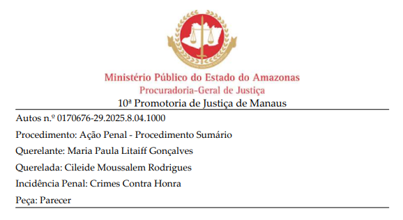 MANAUS (AM) – O Ministério Público do Estado do Amazonas (MP-AM) emitiu parecer favorável à continuidade da queixa-crime apresentada pela jornalista Paula Litaiff contra a blogueira Cileide Moussalem Rodrigues. A ação, protocolada no Tribunal de Justiça do Amazonas (TJAM), acusa Cileide Moussallem da prática dos crimes de calúnia, difamação e injúria, conforme previsto nos artigos 138, 139 e 140, combinados com o artigo 141, do Código Penal, por postagens feitas no Blog CM7, no período de janeiro a junho de 2025.
